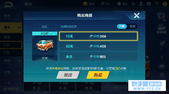 值得注意的是,商城购买的车分三种时效,十天、三十天、永久。 所以购买的是十天或者三十天时效的赛车,魅力值的时效也只有那段时间,永久性拥有是不错的选择,可以攒多点点券,一次性购买永久拥有。 赛车购买之后记得改装下哟,让你跑得更快!