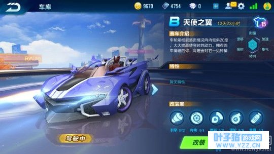 QQ飞车手游 2、转弯小霸王天使之翼 天使之翼作为B级车型,它的理论车速高达216公里/小时,内侧20度转弯倾斜,文字说明的是道路情况,不过小薄荷的感觉就是低速的情况下转弯确实很不错,但是天使之翼的抓地感觉不是那么稳,速度一块转弯基本失灵!