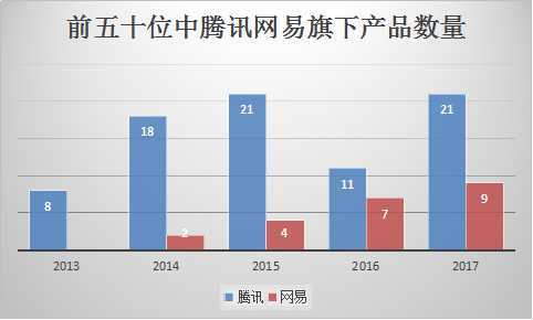 App Store 畅销游戏榜单固化已经不是新鲜事儿了:顶级产品会占据更多的用户以及用户更多的时间与金钱,使得其他产品难以脱颖而出。之所以特别强调手游榜单的固化,是由于手游本身面向的就是用户的碎片时间,一般一两款产品就足以将用户用在手游上的时间压榨殆尽,因此手游榜单的固化现象尤为严重。 这种现象在国外的手游市场已经成为常态,据统计,在美国和日本的 App Store 畅销榜上,运营超过一年的产品均有 15 款,超过两年的也均有 11 款之多。 与国外市场不同的是,国外手游榜单的固化现象更多地与产品挂钩,而国内手游榜单上则是腾讯、网易两大巨头完全占据了榜单的头部位置。 两极格局大势初定 显然,在中国,固化的不是游戏,而是厂商。笔者观察了近五年的国内AppStore游戏畅销榜,网易旗下的上榜产品逐年提高,腾讯虽然在2016年略显乏力,但整体还是保持了极高的产品数量——到2017年结束,榜单前五十位已经被腾讯和网易占据了30个席位。
