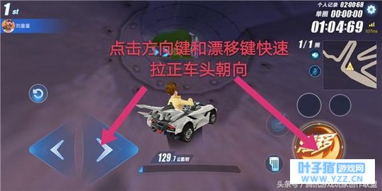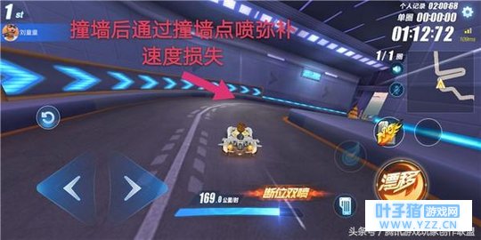 难点 1 解析 在进入该处管道超车点时,赛车的时速一般都比较高。直接通过刹车的方式来减速的话,会造成非常大的损失,最后被对手超越,所以不可取。如上图所示,建议在这处管道的末端使用漂移技巧将赛车的车头朝向提前拉正,这样即使撞向了墙壁依旧能够快速的恢复车速。在即将出管道时,点击方向键和漂移键将赛车的车头朝向迅速拉向右侧即可。
