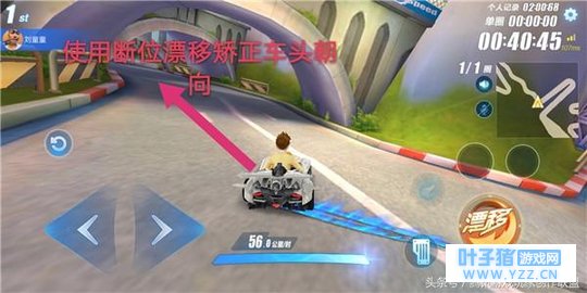 难点 2 解析 这处 s 弯赛道以两侧的墙壁凸起为界限,是可以看做一个狭窄的平直赛道的。这样唯一需要解决的就是赛车在入弯时的车头朝向问题了。如上图所示,可以通过一个停滞漂移接断位漂移的技巧将车头朝向矫正。漂移时点击刹车键触发停滞漂移,在能够直线进入弯道的位置时,快速的点击左方向键拉车头,同时点击漂移键即可触发断位漂移。这样赛车在进入弯道时的车头朝向就比较理想了,只要通过转向进行细微的调整即可。