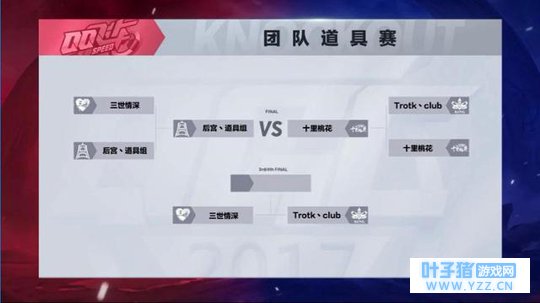 团队道具赛由三世情深、后宫道具组、十里桃花、Trotk这4支队伍争夺冠军,4晋2比赛中三世情深和Trotk被淘汰,三世情深获得季军。决赛中十里桃花一直都占据领先,团队之间的配合十分默契,凭借着在龙门春雪地图中获了第一名和超高的总积分打败了道具组,成为这届QGC冬季赛QQ飞车手游道具赛冠军。