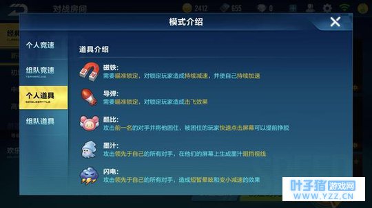 道具模式顾名思义,就是在比赛时候能使用很多道具,地图中可以使用的道具有磁铁、导弹、酷比、墨汁、闪电、香蕉皮、云雾、护盾、龙卷风、氮气、飞碟,而这些道具都是在比赛中拾取。其他模式或多或少,最终拼的都是玩家的操作,道具模式中除了考验你的漂移技巧,还需要你有一点小小的战术和运气。最有意思的是,比赛中不管你处于领先还是落后的位置,都有可能被道具攻击,可能自己前一秒还是第一名,后一秒就变成了倒数第一名,这大大增加了比赛的趣味性。 你落后的时候也不用太着急,可以用闪电、导弹、磁铁等攻击领先的对手,而你领先的时候也不要太得意,保不齐头顶上就会出现一艘飞碟。