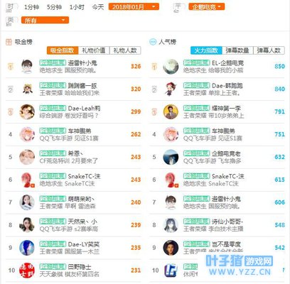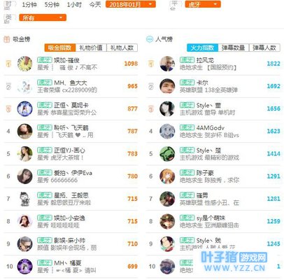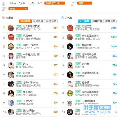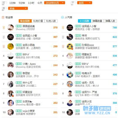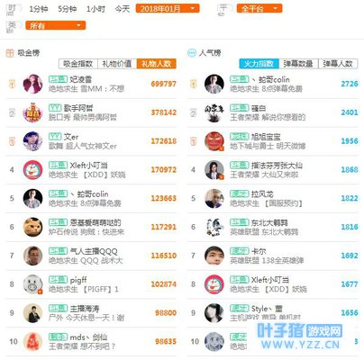 2018年1月,斗鱼主播热度榜——