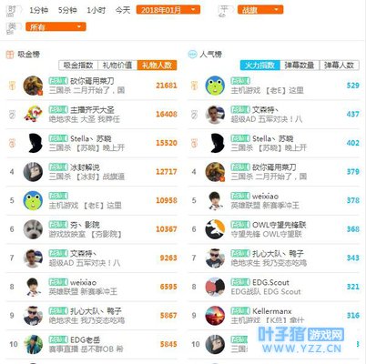 关注点:1.老E登上火力指数榜榜首。2.战旗吸金指数榜有误无法显示,这里给出战旗礼物人数榜——三名三国杀主播位列礼物人数榜前五。3.微笑上月表现不错,登上战旗双榜。 2018年全平台主播热度榜——