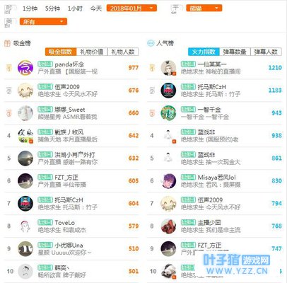 关注点:1.仙某某位列熊猫主播火力指数榜榜首。2.2018年1月,登上熊猫主播火力指数榜前十的游戏主播中,均是直播绝地求生。3.怀念登上熊猫吸金指数榜。 2018年1月,全民主播热度榜——