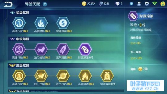 【金币无底洞,驾驶天赋】 那些感觉金币没有用的小伙伴一定要捂紧你们的口袋了。虽说金币的用途不多,可单单这一项就可以吃穷一大批玩家了,这是最吃金币最多的项目,但也是最重要的一个项目。 天赋共分为4个阶段,分别是初级、中级、高级、高级且等级达到40级。初级驾照有3个天赋,中级驾照4个天赋,高级驾照和高级且等级达到40级都是5个天赋,每个天赋最多可以升级5次,每升级一次都对相应级别的赛车进行0-2之间的加成,而且所有天赋点可以叠加生效。 中级驾照一个天赋点需要1000左右的金币,升级次数越多耗费金币越多,第五次可达到2600。而高级驾照需要1300金币起步,第五次可达4300金币。中级“财源滚滚”天赋加到最高需要5000金币,如此算来,中级天赋全部加满最少需要20000金币,高级天赋只会更多。