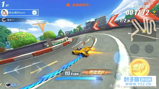 分析:一般在第一个弯道的时候,六辆赛车会一起入弯,如果我们没有做到贴边过弯的准备,就尽量不要和其它车辆抢内道。往往我们通过停滞漂移拉开一点与其它车辆的距离,可以让自己减少与其它车辆的碰撞,进而更好的过弯。一旦调整好车头,我们就可以利用双喷冲出车群。 【心得】