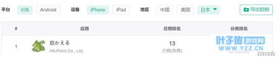 《旅行青蛙》在中国市场上持续保持在appstore免费榜第1,畅销榜成绩曾短暂取得过中国区游戏类收入榜第9。早期在日本表现并不好,后期由于媒体大肆报道其在中国的火爆,带动了这款游戏在日本的排名。今日位于免费总榜的第13名,游戏免费榜第5名。