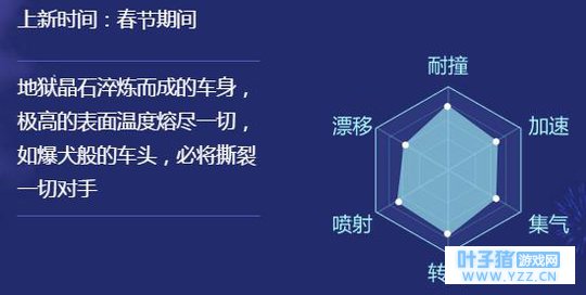 地狱晶石淬炼而成的车身,极高的表面温度融尽一切,如爆犬般的车头,必将撕裂一切对手。 这款车在转向和耐撞上堪称完美。狱火哮天作为A车,在商城中应该不会出售,只会是春节期间的活动获得。 |
