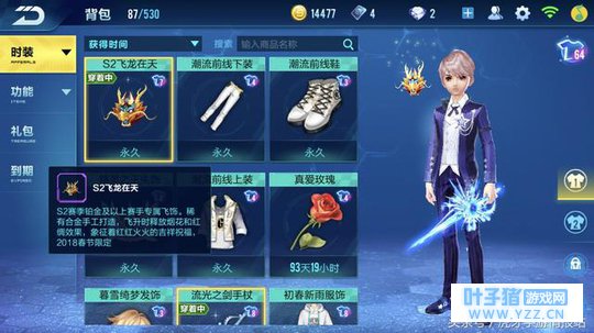 我们点进背包查看它的详细介绍,这个飞饰有一个响当当的名称"飞龙在天",看来我们的设计师也有一个武侠梦啊,S2赛季的飞饰相比于S1赛季的飞饰,增添了更多有趣的地方,例如它会释放烟花和拉一条横幅(横幅只有短暂一会会,不留神看不到哦),S1赛季的飞饰就反而比较单调了,我估计会有很多女玩家争先恐后的麻烦自己的大神好友帮忙上分拿哦。