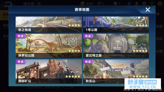 首先是赛季的地图,我们可以在排位赛界面的右侧点击进入"赛季地图"进行查看本赛季可匹配到的地图呢,赛季地图分为竞速模式和道具模式,两个模式的地图可不一样哦,道具模式的地图相对于较为简单,但不适合我们来上分哦,当然技术好的同学咱们直接玩竞速模式呢。