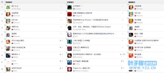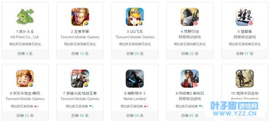 本周免费榜休闲游戏《旅行青蛙》持续领衔,目前该游戏已稳居榜首一个月。腾讯MOBA手游《王者荣耀》排名第2,腾讯竞速手游《QQ飞车》排名第3,网易大逃杀游戏《荒野行动》排名第4,网易武侠RPG手游《楚留香》排名第5。其余游戏如《欢乐斗地主》《穿越火线:枪战王者》《终结者2:审判日》等排名相对稳定。《暗影格斗3》与《地球末日生存》2款游戏近一周排名均在TOP30上下浮动,未来是否能稳居TOP10还未可知。 从TOP10整体榜单来看,一线游戏企业如腾讯、网易依然是免费榜TOP10的常客,目前TIP10腾讯占据4个席位,网易占据3个席位。从游戏类型来看,除了榜首休闲游戏《旅行青蛙》之外,其余9款游戏均为竞技类游戏。上周,网易向外界透露其将豪掷13亿死磕吃鸡手游,未来竞技游戏或成游戏行业重头戏。
