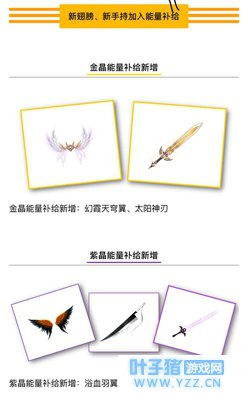 9:金晶、紫晶能量夺宝加入新手持新翅膀! 金晶能量加入幻霞天穹翼、太阳神刃。 紫晶能量加入浴血羽翼、斩玉大刀、紫电神驹光剑! 紫晶为人物打扮的玩家不容错过