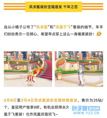 4:凤求凰套装!2月8号更新增加凤求凰装扮宝箱(凤求凰、凤凰于飞)王者荣耀英雄皮肤复刻版。限时2月8号至3月4号,单价25钻石,皇冠用户9折优惠。