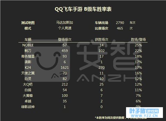 上安智市场,下QQ飞车,领礼包礼券,每天抽A车! 而第一名的NOBLE登场只有57次,其实数据量并不大,不排除其中高手居多的可能,所以胜率高也情有可原。 反观剃刀也有着接近100%的上场率(总场次465,出场459,但不排除有一场多次登场的情况),胜率区局第二,根据官方的数据显示剃刀的综合能力值应该是B级车里最强的,但胜率却不会突出高于其他车型。可见QQ飞车这个游戏对于操作要求极高,一个好的玩家也可能把性能不出众的车开成秋名山车神啊!