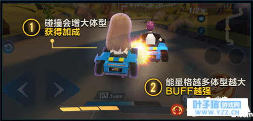 值得注意的是,多次碰撞之间将会有短暂的CD以避免极短时间连续碰撞导致能量格增加过快。 同时,伴随着每次体型增大,车手们也会获得速度加成。能量格越多,速度增加的越多,BUFF也会越强。但当玩家当前处于第一名时,速度加成会暂时取消。