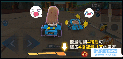 当玩家通过碰撞储蓄能量到第4格的时候,体型就会增大到可以压扁场上能量为3格和3格以下的玩家,被“巨人”撞到的玩家将会被压扁,并且短暂减速。伴随着一声被压扁的提示声,巨人车手将用更快的速度超越被压扁的玩家,向终点前进! 落后的车手也不必气馁,巧用碰撞增大体型,奋起直追吧!