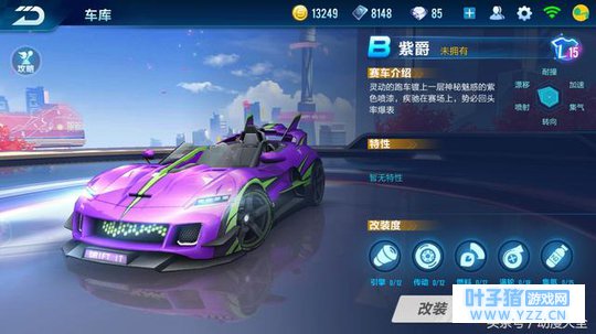 性能:耐撞2.0 加速1.3 集气1.2 转向2.0 喷射1.22 飘移1.2(此数据以六边形长度划分得出,有微小误差) 紫爵
