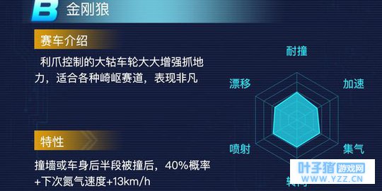 赛车介绍:利爪控制的大轱车轮大大增强抓地力,适合各种崎岖赛道、表现非凡 赛车特性:撞墙或车身后半段被撞后,40%概率+下次氮气速度+13km/h 速度分析(图片量太多,文字表达) 平跑:194.7㎞/h 氮气(C):267.1km/h WCW喷:283.4km/h CWW喷:299.8km/h