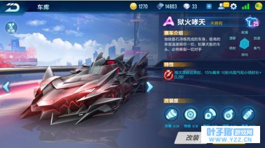 下面是要着重推荐的这一款A级的狱火哮天,虽然它的漂移性能并不如上面三款车辆来的那么顺畅,但是它的喷射效果非常强大。它的特性是每次漂移结束时有百分之十五的概率在十秒内氮气和小喷的时长会增加0.2秒。所以说这款车使用氮气加速的时候比其它的车来的更有效果,推进的时间更长。