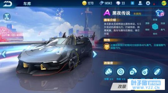 第二个推荐的A级赛车是黑夜传说,黑夜传说这款赛车是一款性能比较均衡的赛车,它的特性是在比赛结束倒计时立刻获得40%的集气,而且撞墙之后集气还会保留70%。是一款容错率非常高的赛车。