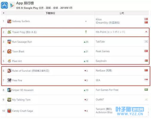 此外,网易的两款“吃鸡”游戏——《荒野行动》和《终结者2:审判日》——依然保持强大热度,虽然排名有所下滑,但依然在Top 10榜单内。 纵观整个Top 10榜单,除了《旅行青蛙》和《恋与制作人》之外,其它8款都是腾讯和网易的产品,下载榜和收入榜都已经被这两家巨头攻陷了。 日韩美榜单:吃鸡游戏风靡 我们一起看看日本、韩国、美国榜单的情况。 日本方面,两款国产游戏依然保持较好成绩。网易的《荒野行动》依然稳居日本综合下载榜第一,在极高壁垒的日本市场能保持这样的成绩实属不易。《碧蓝航线》依然在收入榜Top 10内,比上一个月名次有所下滑,本次排名第10。 韩国方面,SEA的吃鸡游戏《Free Fire》综合下载榜排名上升了2个名次,夺下第3的成绩。现在全球手游厂商都在争夺吃鸡市场,谁能抢先一步,就占得先机,网易是反应最快、打的最猛的,SEA则从自己的优势地区——东南亚开始圈地,目前来看他们也夺下了韩国这一城。收入榜方面,国产游戏《少女前线》和《崩坏3》都依然在Top 10的榜单,前者上升两个名次,后者下滑两个名次,分列第7和第10。 美国方面,网易的《终结者2:审判日》依然处于综合下载榜Top 10,排名第6。收入榜Top 10基本上都是老产品面孔,涨幅比较大的是三消游戏《Toy Blast》上涨8个名次,排名第9。 |