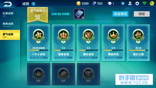【成就奖励】 游戏中我们可以通过比赛来获得很多的成就,每一个成就完成的时候,都能获得点券奖励,而且当总成就达到一定时,还能获得额外点券奖励。