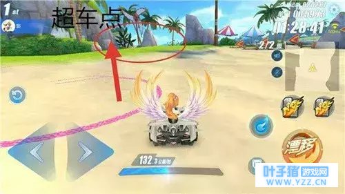 【超车点2】 通过木板路后,会落入水中,这里选择走偏向右边的道路(如下图),这样可以再次完成一次小飞跃,进行两次小喷。 注意:千万不要撞到拱桥,否则会退回水中,并且停在水中,这样就只能点击左方的归位键重新归位,会浪费很多时间。
