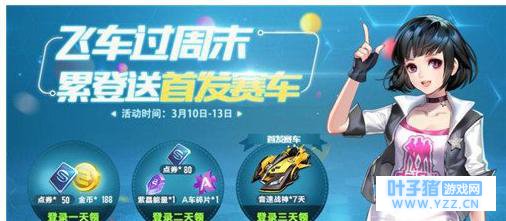 ▲ 金刚狼&甩葱手杖 活动时间:3月10日至3月15日 3月10日—3月15日活动期间,完成每日任务即可获得水滴和小树苗,用于兑换奖励。 登录游戏:获得水滴*1 与好友同跑1局:获得水滴*1 参与1局道具赛:获得小树苗*1 参与3局任意比赛:获得小树苗*1 好礼兑换: 1个水滴 + 1个小树苗可兑换40点券 2个水滴 + 2个小树苗可兑换金刚狼(3天) 4个水滴 + 4个小树苗可兑换甩葱手杖(90天)。 【好礼八:周末登录送首发赛车】