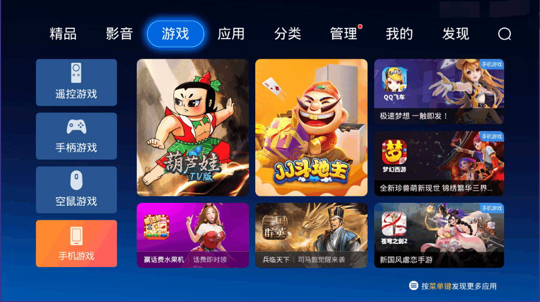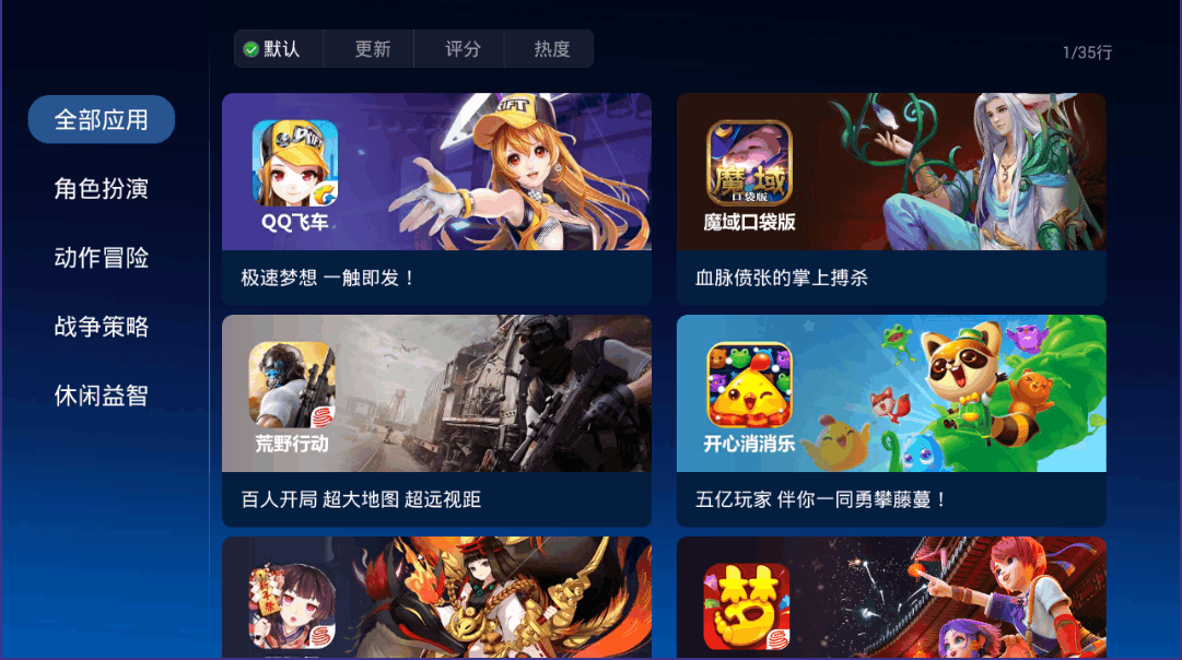 当贝市场是专为智能电视量身打造的应用商店,涵盖了数千款的大屏电视APP,内容包括视频、游戏、音乐、生活、工具等多个分类。为电视用户提供更丰富的家庭娱乐方式,在游戏页面新增了手机游戏,可自行选择角色扮演、动作冒险、战争策略、休闲益智四种中喜欢的手游。