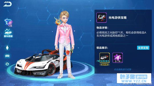 幸福花架鞋 No.3 光电游侠点券礼盒上线 头段时间,天美依然是套路了一波各位玩家。要充值很多钻石,才送30天的光电游侠!而现在,光电游侠在商城里成为了450点券一个的宝箱!有攒点券习惯的小伙伴们,可以去试试水了。毕竟花猫是一个藏不住任何东西的玩家,所以呢花猫只买了两个宝箱试水,出了一个A车碎片,出了一个三天的袭影。虽然花猫欧气十足,但是运气这东西也不是随时能有的。