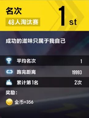 最后一轮即 第四轮 ,只有笑到最 后的唯一 一名车手能够晋级 ,其余车手全部都会被淘汰。胜利的桂冠只能属于一人,请全力以赴冲向前方吧! 嘿嘿嘿,车手们是不是觉得超级过瘾呢?想要取得好的名次,就得凭借过人的车技呀!为了犒赏努力比赛的你们,小橘子在48人淘汰赛里准备了 丰厚的奖励 !