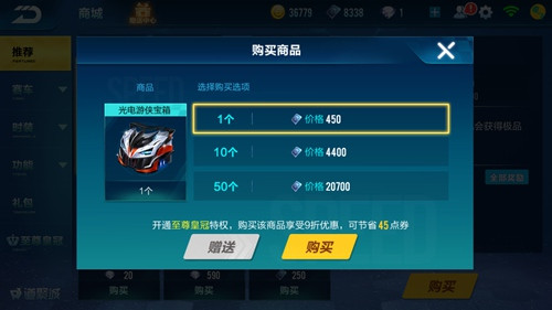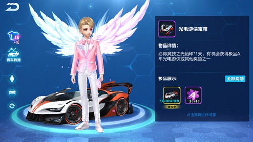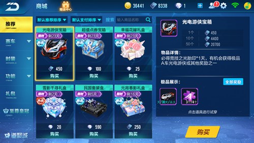 光电游侠是目前QQ飞车手游推出的唯一一款可以通过点券购买礼包的A级车,1个礼包只需要450点券,最多一次购买50个礼包,开启礼包则有几率获得A级车光电游侠。