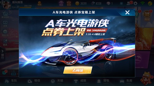 目前QQ飞车手游A级车光电游侠已经限时上架游戏商城,我们可以在商城推荐中看到光电游侠礼包,通过抽取礼包则有几率获得这款A级车。
