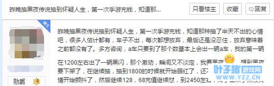 网友的抽奖具体历程是这样的: 抽黑夜传说抽到怀疑人生,第一次手游充钱,知道那种抽了半天不出的心情吧,很多人估计都有,车子不出,每次都想放弃,最后还是没忍住,放弃意味着之前都没有了。多方咨询,a车只要到了那个数基本上会出一辆a车,我的第一辆在1200左右出了一辆黑闪,那个激动,瞬间又不淡定,我要黑夜!想到黑夜要下架了,在继续抽,抽到1800的时候就开始眼红了,还不出2300的时候,心情开始颤抖了,然后继续128,68充值继续怼,到2450左右,终于出来了黑夜传说!