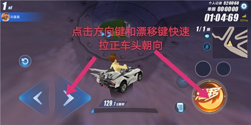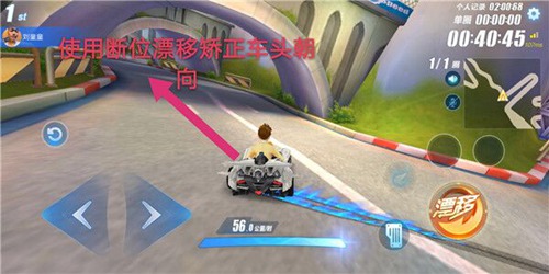 难点1解析 在进入该处管道超车点时,赛车的时速一般都比较高。直接通过刹车的方式来减速的话,会造成非常大的损失,最后被对手超越,所以不可取。如上图所示,建议在这处管道的末端使用漂移技巧将赛车的车头朝向提前拉正,这样即使撞向了墙壁依旧能够快速的恢复车速。在即将出管道时,点击方向键和漂移键将赛车的车头朝向迅速拉向右侧即可。