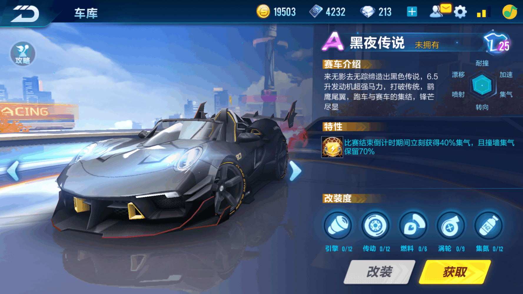 这辆A车是点券寻宝里唯一可以出的永久A车,所以对于平民玩家来说是性价比非常高的赛车了。如果一不小心抽到永久,真的是可以一直用下去了。这辆赛车属性虽然没有上面几辆车好,但是胜在性价比较高。 特性:复位后立即获得小喷,且20秒内基础动力增加40% 第二名:黑夜传说