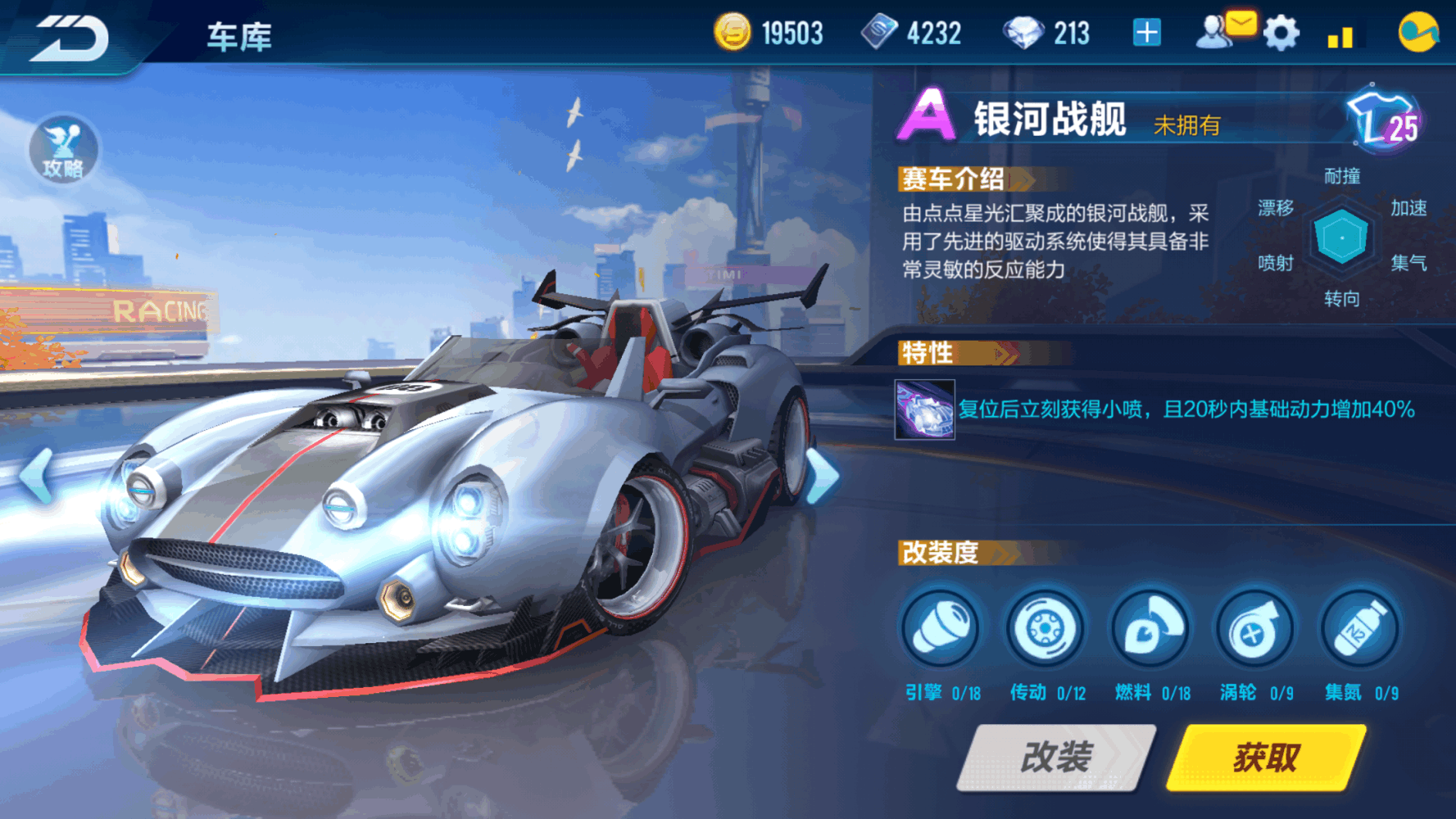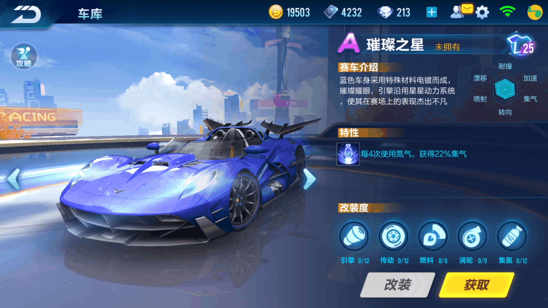 这辆赛车和黑色闪电是兄弟赛车,但是整体上的属性比黑色闪电更为优秀,属性更加的均衡,也更加适合竞速赛道。这类赛车的上手难度较低,同时操作空间大,可操作性强,深受大神车手的喜爱。这辆车的优点在于发动机的动力强大,在起跑加速和氮气加速时的提速非常快,属于冲刺性赛车。但正是因为这个特点,所以赛车的驾驶难度高,尤其是在狭窄路段和连续弯道路段,短时间内速度的快速提升总让人来不及反应。 特性:比赛结束倒计时期间立刻获得40%的集气,且撞墙集气保留70% 第三名:璀璨之星