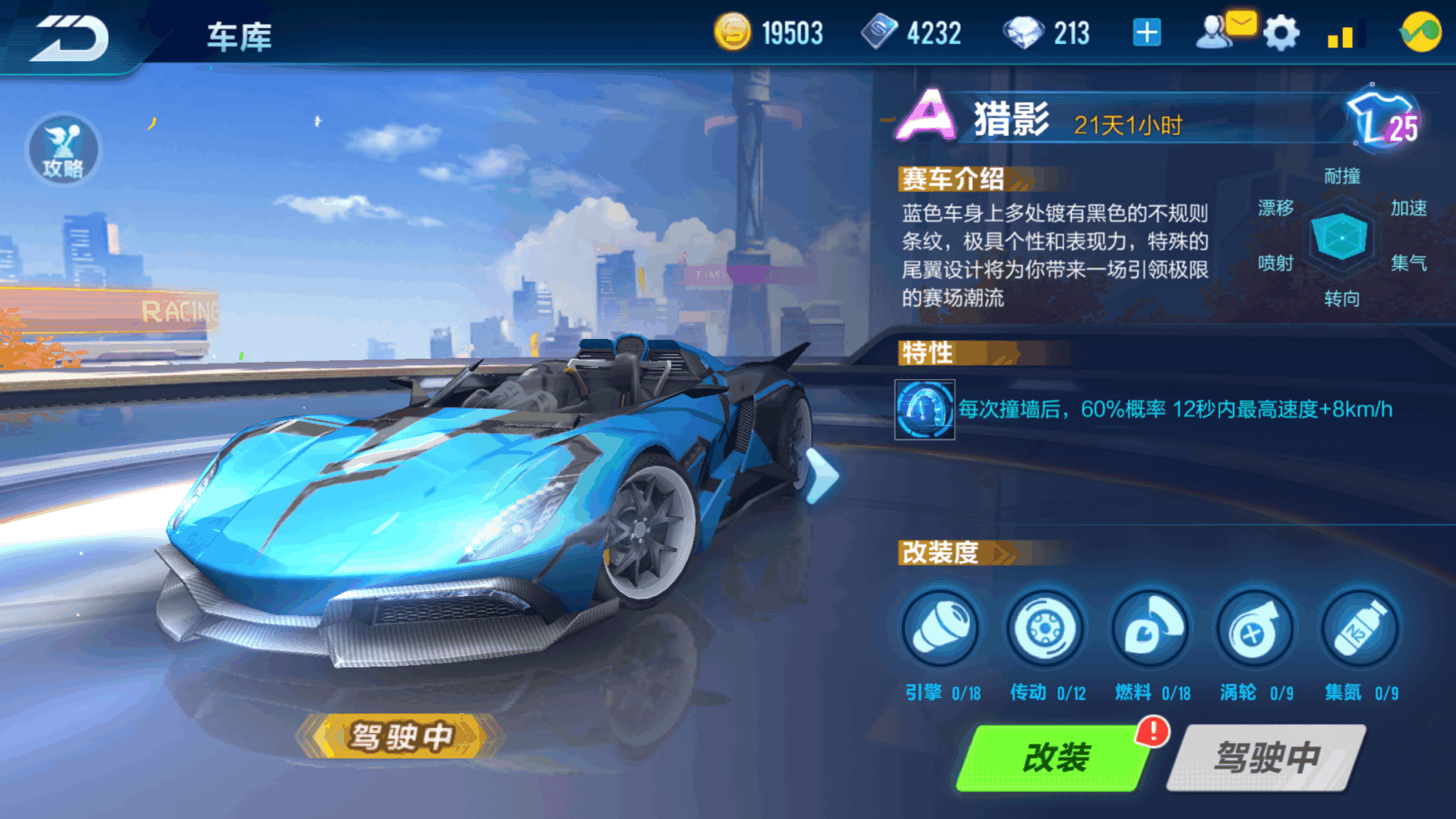 这辆赛车是杰哥的代言人专用车,车身上还有他的签名LOGO,因为是代言人用车,所以本身的属性不会太差。这辆赛车外形酷炫,性能优越,是一辆不可多得的豪车的。 特性:每4次使用氮气,获得22%集气 第四名:猎影