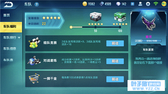 车队福利 在车队福利中,同样可以获得点券。当我们车队活跃达到50和100时,可以领取对应活跃度的车队宝箱。获取车队活跃的方法可在车队福利界面看到,见下图。