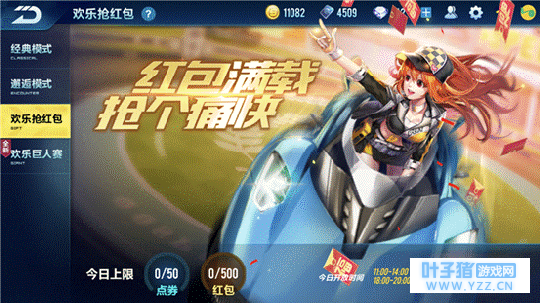 欢乐抢红包 在对战房间的选项下,左边菜单第三个选项就是欢乐抢红包。欢乐抢红包每天可以获得50点券,一周就是350点券。但是开放时间也是有限制的。每天的11:00-14:00以及18:00-20:00是抢红包模式开放的时间。 这个模式比较简单,技巧就是围绕地图周围旋转,控制好赛车的方向,就可以获得大量的红包。大红包奖励的得分比较高,得分越高收获的点券越多。在游戏中还可以获得道具,攻击类的道具不仅可以减少其他人的红包数,还能增加我们自己的红包数!倒计时结束后,结算界面会显示本局获得的点券数和金币数。