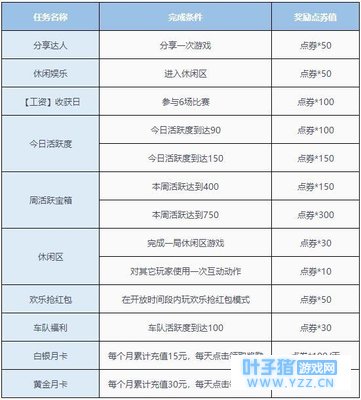 额外途径 如果我们一个月充30元激活月卡的话,不仅可以一次性到账300钻石,同时我们每日还可以领取250点券+10钻石!相当于只花了30元,买了600钻石+7500点券,首充的车友还会额外获得300钻石,是不是超级划算! 总结 以上就是本人总结的所有获取点券的途径了,下面再给大家用表格展现一下: