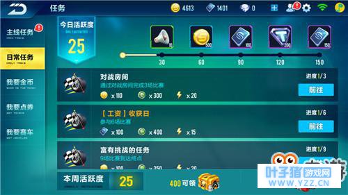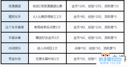休闲区任务: 不少车友都忽视了休闲区,其实在休闲区中也能够获得经验的,我们只要在休闲区在线10分钟,就能完成休闲区中的任务,领取300经验作为奖励。