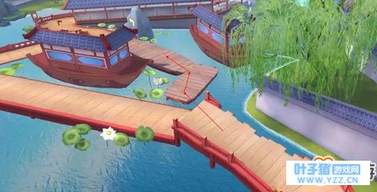 第二处难点藏在荷花后的 弹跳带 ,这边需要玩家贴近左边漂移,让车头先倒过来横向侧滑踩上弹跳带