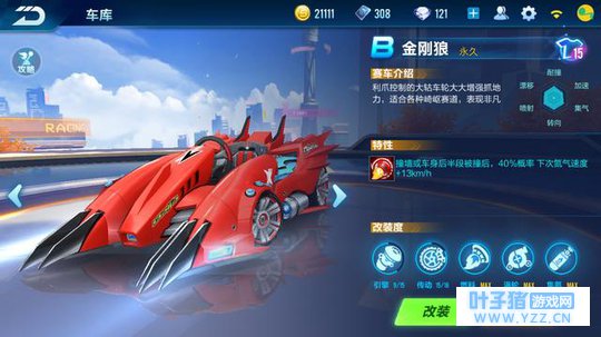 B车金刚狼(撞墙或者车身后半段被撞后,40%概率 下次氮气速度+13km/h)