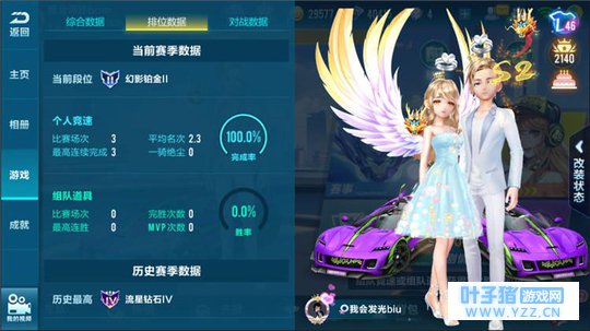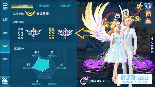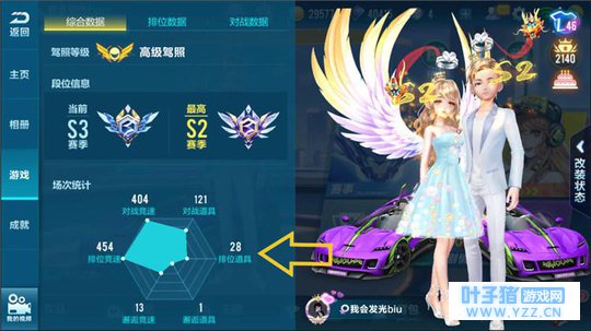 排位数据 排位数据里面主要对我们参与的排位赛进行了各项统计和记录,同样分为当前赛季数据的统计和历史赛季数据的统计,和综合数据一样,历史赛季数据统计也是记录段位最高赛季的数据。 排位数据记录的数据有三个:段位等级、个人竞速数据,组队道具数据。段位等级不用多说了,个人竞速数据记录了我们参与个人竞速排位的场次、平均名次、最高连续完成次数、一骑绝尘次数以及比赛的完成率,组队道具数据则是记录了我们参与组队道具排位的场次、完成次数、最高连胜、MVP次数以及比赛的胜率,数据越高,自然也就说明我们的实力越强。