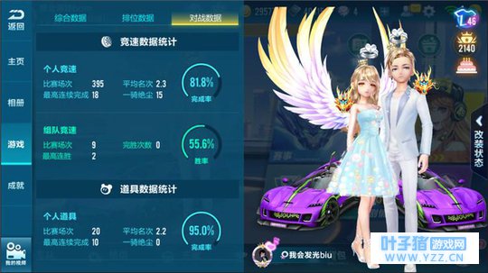 对战数据 对战数据里面记录了除了排位数据以外的所有比赛数据,分为竞速数据统计、道具数据统计和邂逅数据统计,其中竞速数据统计和道具数据统计又分为个人模式和组队模式,邂逅数据统计又分为邂逅竞速和邂逅道具,对战数据和排位数据一样,把每一种模式的各个数据都做了详细的统计。但是由于对战模式匹配到的对手段位参差不齐,所以对战数据并不能作为判断我们实力的依据,只能作为参考。
