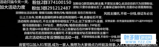 本次的福利是仅限粉丝内的,可见叶大神是有多宠粉。只要满足自备钻石条件的粉丝,叶大神免费包抽中A车,风险全由主播自己扛!