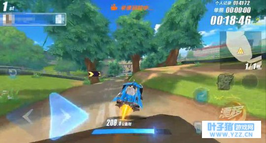 就是车头朝向的这两棵树在中间!这个就有人说了,肯定下面会快一些啊!答案是肯定的,往下走直线会快上一些,但相差不大,想要抢占内道卡位的话,就建议大家试试飞上去,给别人来一个触不及防的内侧弯道卡位超车!